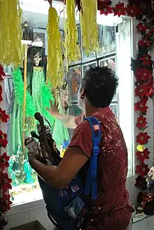 Rituals dedicated to Santa Muerte include processions and prayers with the aim of having a miracle granted.[10] Some believers of Santa Muerte remain members of the Catholic Church,[20] while others are cutting ties with the Catholic Church and founding independent Santa Muerte churches and temples.[39] Santa Muerte altars generally contain one or multiple images of the saint, generally surrounded by any or all of the following: cigarettes, flowers, fruit, incense, water, alcoholic beverages, coins, candies and candles.[21][10] Tobacco is also used for personal cleansing and for cleansing statues of Santa Muerte [40]