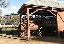 A fair proportion of these objects are original to specific sites and are located in situ - for example, the 1948 Ronaldson and Tippet power generating plant in the homestead powerhouse; the c 1912 grindstone at the woolshed; four old bu presentable Peugeots in a shed near the Homestead and the 1926 petrol pump also near the homestead (under a shelter), identified as a LASCO Larkins Aircraft Supply, understood to be the only working original example in Australia.. Other objects are located at sites with which they are primarily associated e.g. the Clayton and Shuttleworth steam engine no 27258 used to provide power to the woolshed from 1912 to 1938 and the c.1860s grindstone moved from Mulwala Station woolshed.[1][4]