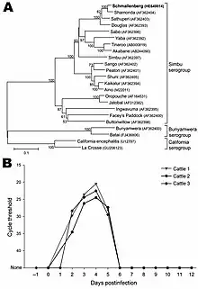 (A) Phylogenetic relationship between Schmallenberg virus and orthobunyaviruses of the Simbu, Bunyamwera, and California serogroups. (B) Detection of Schmallenberg virus genome in the blood of experimentally infected calves.