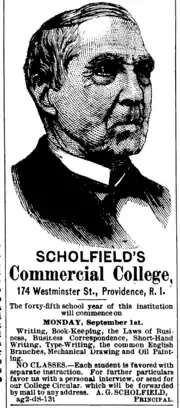 - ↑ "Scholfield's Commercial College". Fall River Daily Evening News. 4 October 1890. p. 2. Retrieved 24 May 2020.