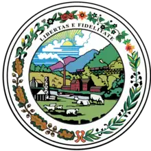 The Great Seal of the State of West Virginia was adopted in September 1863.[1] The obverse center of the seal contains a boulder that has been inscribed June 20, 1863, the date West Virginia became a state. In front of the boulder lie two crossed rifles and a liberty cap as a symbol of the state's fight for liberty. The two men on either side of the boulder represent agriculture and industry. On the left stands a farmer with an ax and plow before a cornstalk. On the other side stands a miner with a pickaxe, and behind him an anvil and sledge hammer. The outer ring contains the text "State of West Virginia" and the state's motto "Montani Semper Liberi", ("Mountaineers are Always Free"; the state nickname is "the Mountain State"). The reverse of the seal, also called the lesser seal, is the official seal of the governor. Its motto reads "Libertas E Fidelitate" ("Liberty out of Fidelity").[2]
