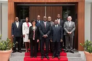 The cabinet was formed following the collapse of the first Wescot-Williams cabinet in April 2012, when United Peoples faction leader Romain Laville left his party and became an independent member of parliament.[2] A coalition agreement between the National Alliance and the Democratic Party and I3, consisting of independent MPs Frans Richardson, Patrick Illidge and Romain Laville, was signed on 11 May 2012, and a new cabinet was installed on 21 May 2012.[3][4]