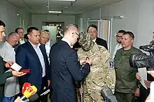 On August 21, 2014, by the decree of the President of Ukraine Petro Poroshenko, Semenchenko was awarded the Bohdan Khmelnytsky Order, Third class for "personal courage and heroism shown during protection of the state sovereignty and territorial integrity of Ukraine, dedication to loyalty oath, highly professional execution of his duty".[30][31] He was awarded for the service in the battle shown while liberating the cities of Artemivsk, Popasna and Lysychansk. On September 1, 2014, the Order was handed together with a service gun — the Makarov pistol from the Head of SBU.[32][33]
