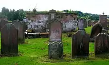 Grierson of Lag was a byword for evil among the common Presbyterian folk in Annandale, who gravely asserted that he, like the other persecutors of the Covenanters, had intimate dealings with the devil, and that he was "partly in hell" before his death, in evidence of which they told that his saliva burnt holes where it fell, and his feet put into cold water made it boil.[7] Lag died, aged 77, at his town house in Dumfries on 31 December 1733. He was buried two days later in the Grierson family burial plot in Old Dunscore Churchyard, the cost of the funeral being £240 Scots. A story was told that on the night he died a chariot surrounded by thunder clouds swept his soul away to hell. Another described how the horses pulling his hearse to Dunscore churchyard died of exhaustion on the way and a black raven flew down and settled on the coffin, flying away only at the moment of burial. The antiquary Charles Kirkpatrick Sharpe claimed that the story regarding the horses was in fact true, and that his grand-uncle Sir Thomas Kirkpatrick, a nephew of Lag's, had both attended the funeral and supplied the horses which subsequently died.[7] Whereas the Presbyterian martyrologists had listed the names of those shot at the hands of Lag's men, the tales that grew up after his death became more lurid, and in later years locals pointed out a spot on Halliday Hill, near Lag Tower, where the Laird was said to have rolled Covenanters downhill in a barrel filled with spikes.[8]
