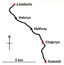 | Halfway | 53°05′44″N 4°05′46″W / 53.0956°N 4.0960°W | 1,641 ft (500 m) | As the name suggests, halfway along the line and close to the 'Halfway House' on the nearby footpath. A short distance above the station is a path that leads down to the Halfway House cafe. |