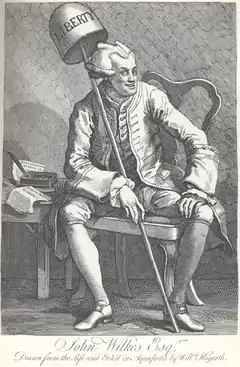 After a later period of exile brought about by further charges of libel and obscenity, Wilkes stood for the Parliamentary seat at Middlesex, where most of his support was located.[19] When Wilkes was imprisoned in the King's Bench Prison on 10 May 1768, a mass movement of support emerged, with large demonstrations in the streets under the slogan "No liberty, no King."[20]