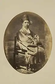 Photograph of a yangban man from 1863, diplomat appointed to the Chinese court. He wears the winged hat of an official, a shimmering silk gown and the waist buckle of a high-ranking official.