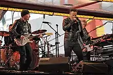 To promote the album, the band made appearances on several television and radio programs, including RAI TV's Che tempo che fa in Milan,[121] Canal+'s Le Grand Journal in Paris,[122] BBC One's The Graham Norton Show[123] and BBC Radio 2 in London,[124] BBC Two's Later... with Jools Holland,[125] and RTÉ One's The Late Late Show in Dublin.[126] The group also performed "Every Breaking Wave" at the 2014 MTV Europe Music Awards.[127] The promotional tour was interrupted when Bono was injured in a "high energy bicycle accident" in Central Park on 16 November 2014. He suffered fractures of his shoulder blade, humerus, orbit, and pinky finger, requiring five hours of surgery at NewYork–Presbyterian Hospital/Weill Cornell Medical Center's Emergency Department.[128] Bono said he was uncertain that he would ever be able to play guitar again.[129] The injury forced the band to cancel a headlining appearance at KROQ Almost Acoustic Christmas,[130] as well as a week-long residency as the musical guest on The Tonight Show Starring Jimmy Fallon.[131] The other three members of U2 kept a commitment to perform in Times Square on World AIDS Day on 1 December 2014; Chris Martin of Coldplay and Bruce Springsteen filled in as lead vocalists.[132] U2 returned to The Tonight Show on 8 May 2015, and participated in sketches in which they mocked Bono's bicycle injury and busked in a New York City Subway station in disguise. The group also unveiled a video previewing their Innocence + Experience Tour.[133] To recompense the Los Angeles area for dropping out of KROQ Almost Acoustic Christmas, the band performed for 500 fans at the Roxy Theatre in Hollywood on 28 May 2015 while between shows of their arena tour.[134]