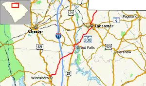 SC 200 is mostly a rural two-lane highway, traversing northwest from Winnsboro, through Great Falls and Lancaster, to the North Carolina state line.[6]
