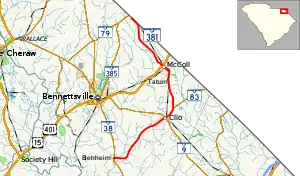 SC 381 traverses from Blenheim at SC 38 to the North Carolina state line where it continues as North Carolina Highway 381 into Gibson, North Carolina. As a two-lane rural highway, it connects the towns of Clio and McColl.[2]