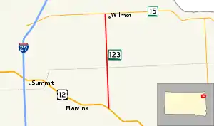 South Dakota Highway 123 (SD 123), 467th Avenue, is a 10.486-mile (16.876 km) north–south state highway in Grant and Roberts counties in South Dakota, United States, that connects U.S. Route 12 (US 12) with South Dakota Highway 15 (SD 15).[3]