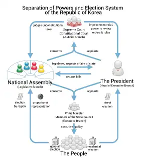 In October, the Soviet Union declared Kim Il-sung's government as sovereign over both the north and south. The UN declared Rhee's government as "a lawful government having effective control and jurisdiction over that part of Korea where the UN Temporary Commission on Korea was able to observe and consult" and the government "based on elections which was observed by the Temporary Commission" in addition to a statement that "this is the only such government in Korea."[96] Both leaders engaged in authoritarian repression of political opponents.[97] South Korea requested military support from the United States but was denied,[98] and North Korea's military was heavily reinforced by the Soviet Union.[99][100]