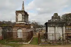 • a cemetery "consisting mainly of fairly ordinary above-ground tombs ... noteworthy for three high style Renaissance Revival tombs near the entrance. The Welham tomb is particularly significant with its castiron vermiculated quoins and arches."[2]