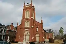 • St. Michael's Church (c. 1875), a cruciform basilica with a tower in Gothic Revival and Romanesque styles. It has a "five bay, aisled nave, and a massive altar set in a great niche whose back wall is cut through with a colonnade screen. The church is entered through a vestibule set in the base in a single central tower. In the ornate nave, multishaft columns rise to foliated capitals which support sets of Romanesque double arches. The exposed truss roof features King posts and foliated hanging pendants. The building is constructed of brick laid up in common bond. The exterior features the verticality, pinnacles, buttresses, and multiple arches of the Gothic style. Yet the numerous semicircular arches and blind arcading are Romanesque. Despite the mixture of styles, the blend is entirely harmonious and elegant. At one time there was an octagonal spire; however, it was blown down in the 1975 hurricane."[2]