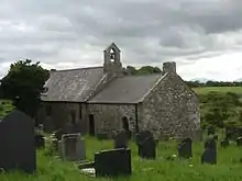 St Cwyllog's Church is in a rural location in the middle of Anglesey, about 3 miles (5 km) north-west of Llangefni, the county town, and a short distance from the small village of Llangwyllog.[4] The village takes its name from the church: the Welsh word llan originally meant "enclosure" and then "church", and "–gwyllog" is a modified form of the saint's name.[5]