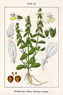 3. "Stachys annua annual yellow woundwort". The Royal Horticultural Society. Retrieved 2 January 2021.