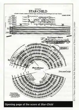 Star-Child was commissioned by the Ford Foundation and written in 1977. It is Crumb's largest work and requires 47 instrumentalists as well as many vocalists. It calls for soprano, antiphonal children's voices, male speaking choir, bell ringers, and large orchestra.[2] Originally, the orchestra members spoke as well as played, and the children’s choir also played the handbells, but this was later revised in 1979 to the current personnel list.[3] The current personnel lists calls for 4 flutes (also playing 4 piccolos), 4 oboes (1 doubling on English horn), 3 clarinets in B♭, 1 clarinet in E♭, 3 bassoons, 1 contrabassoon, 6 horns, 5 trumpets in C, 2 trumpets in D, 3 trombones, 1 tuba, 8 percussionists, 1 organ, 1 solo soprano, children's voices I and II (SASA), male speaking choir playing handbells, violins I, violins II, violas, cellos, and contrabasses. 2 primary conductors and 2 secondary conductors are also needed.[4]