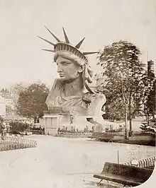 Although plans for the statue had not been finalized, Bartholdi moved forward with fabrication of the right arm, bearing the torch, and the head. Work began at the Gaget, Gauthier & Co. workshop.[48] In May 1876, Bartholdi traveled to the United States as a member of a French delegation to the Centennial Exhibition,[49] and arranged for a huge painting of the statue to be shown in New York as part of the Centennial festivities.[50] The arm did not arrive in Philadelphia until August; because of its late arrival, it was not listed in the exhibition catalogue, and while some reports correctly identified the work, others called it the "Colossal Arm" or "Bartholdi Electric Light". The exhibition grounds contained a number of monumental artworks to compete for fairgoers' interest, including an outsized fountain designed by Bartholdi.[51] Nevertheless, the arm proved popular in the exhibition's waning days, and visitors would climb up to the balcony of the torch to view the fairgrounds.[52] After the exhibition closed, the arm was transported to New York City, where it remained on display in Madison Square Park for several years before it was returned to France to join the rest of the statue.[52]