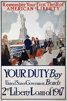 After the United States entered World War I in 1917, images of the statue were heavily used in both recruitment posters and the Liberty bond drives that urged American citizens to support the war financially. This impressed upon the public the war's stated purpose—to secure liberty—and served as a reminder that embattled France had given the United States the statue.[127]