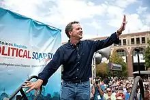 In 2017 Bullock formed the Big Sky Values PAC, which by spring 2019 had raised nearly $1.8 million, to pay for travel around the United States.[48] On May 14, 2019, Bullock announced his candidacy for the 2020 presidential election.[49][50] In his announcement video, Bullock said that opposing political "dark money" and legislating against the Citizens United Supreme Court ruling would be among his utmost priorities.[51] Based on his three statewide electoral victories in a Republican-leaning, largely rural state, Bullock held a certain cachet of "electability", and appeared to have a plausible path to the nomination.[52] His mid-May entrance was relatively late, but he was still able to qualify for the second Democratic debate in July.[53] Even so, the late start left him with less media exposure than his numerous rivals: he found it hard to raise funds, and never rose above 1% in nationwide polls.[53] He ended his campaign on December 2, 2019.[54]