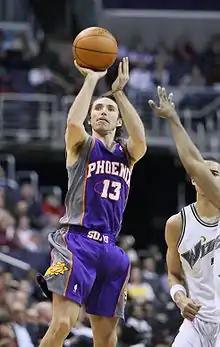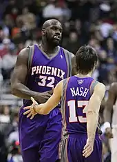 Nash played in 81 regular season games during the 2007–08 season; in this campaign, the Western Conference was especially competitive and he led the Suns to 55 wins and the sixth seed for the 2008 playoffs. Although there was a dip in his regular season output, Nash's shooting remained sharp; the accuracy of his shooting was on par with his 2005–06 MVP campaign (shooting at least 50% from the field, 40% from the three-point arc, and 90% from the free throw line).[16] On 31 January 2008, he collected his All-Star stripes for the sixth time in his career.[41] However, Nash continued to experience agony in the playoffs. Despite a mid-season trade that sent Shawn Marion to the Miami Heat and brought four-time NBA champion Shaquille O'Neal to the team, the Suns were defeated in the first round of the 2008 playoffs by the San Antonio Spurs for the third time in four years.[42] In the deciding Game 5, Nash was perceived to have suffered from "elimination-game jitters", and turned over the ball twice in the final two minutes of what was a tight contest.[42] Nevertheless, Nash was later named to the All-NBA Second Team for the 2007–08 season.[43]