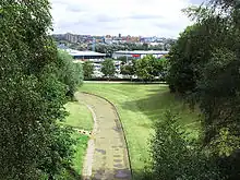 2005 view from the middle of the suspension bridge, looking out over the eastern edge of the retained garden parkland. Beyond, the new out-of-town retail park merges into Stoke-on-Trent's city-centre.