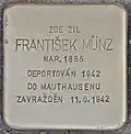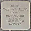 Gertruda Glauberová née Zinner, also called Gertrude or Trude, was born on 24 August 1909 in Hlinsko. Her parents were Ludwig Zinner and Stefanie née Bergmann, also Steffi. She had a sister named Marianna, born on 20 March 1906, later married as Kraus. She married Valtr Glauber (see above). The couple had a son, Karel, born in 1937 (see above). She was arrested, separated from her child and deported to Auschwitz concentration camp. There she was murdered on 16 January 1943.[23][24]