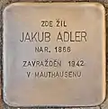 Jakub Adler was born on 26 May 1866 in Velký Bor. His parents were Simon Adler and Rosalia née Treichlinger. He had two sisters, Lotti (born 1867) and Marie (1868–1920). First he married Sofia née Schnürdreher. The couple had two children, Eleanor (born 1890) and Karl (born 1891). His wife died in 1903.[2] Thereafter he married Růžena née Fröhlichová. The couple had at least three sons and two daughters, Josef (also Jozef, born 1904), Anna (born 1906, later named Pisinger), Ota (born 1908), Jindřiška (born 1910) and Jaroslav. He was a merchant, his wives were housewives. He was arrested and deported by the Nazi regime to Mauthausen concentration camp. He lost his life there in 1942.[3]