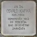 Otakar Kafka, also Otokar, was born on 10 August 1919. His parents were Max Beniamin Meir Kafka and Beila Berta Kafková. His father traded with eggs. He had an older brother, Osvald (born 1908). Together with mother and brother he was deported on 26 November 1942 from Klatovy to Theresienstadt concentration camp by transport Cd. His transport number was 129 of 651. On 13 December 1942, his mother died in Theresienstadt. Seven days later, on 20 December 1942, he was murdered by the Nazi regime in Theresienstadt.[32][33]