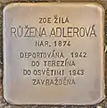 Růžena Adlerová née Fröhlichová was born on 16 June 1874. Her parents were Leopold Fröhlich and Barbora née Herrmann. She was married to Jakub Adler. The couple had at least three sons and two daughters, Josef (also Jozef, born 1904), Anna (born 1906, later named Pisinger), Ota (born 1908), Jindřiška (born 1910) and Jaroslav.[10] Her husband was a merchant, she was a housewife. She and her children Ota and Jindřiška were deported on 26 November 1942 from Klatovy to Theresienstadt concentration camp by transport Cd. Her transport number was 169 of 651. In Theresienstadt, the family was separated. First, in January 1943, her daughter Jindřiška was deported to Auschwitz concentration camp. She was murdered there. Then, on 6 September 1943, her son Ota was deported to Auschwitz. He was murdered there too. At last, on 15 December 1943, also Růžena Adlerová was deported to Auschwitz by transport Dr. Her transport number was 44 of 2,519. She was murdered there.[11][12]