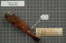 1. BirdLife International (2016). "Rhipidura dedemi". IUCN Red List of Threatened Species. 2016: e.T22706890A94095567. doi:10.2305/IUCN.UK.2016-3.RLTS.T22706890A94095567.en. Retrieved 12 November 2021.