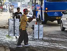 Street vendors are common sight in Indonesian street, in addition to hawkers peddling their goods on bicycles or carts. These carts are known as pedagang kaki lima – named after five-foot width pavements which they occupied. Another popular theory suggests that the term kaki lima is also named after the sum of the feet; pushcarts with three feet (two wheels and a stabiliser wooden foot), and the two-footed vendors who push them.[9]
