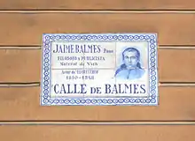 Influenced by romantic historiography, Balaguer introduced numerous Catalanist names, opening the door for numerous Catalan towns that followed suit.[75] He created several streets named after territories linked to the Crown of Aragon: Valencia, Mallorca, Aragon, Provence, Roussillon, Naples, Calabria, Corsica, Sicily, and Sardinia; institutions such as the Catalan Courts, the Catalan Parliament, the Diputation, or the Council of One Hundred; characters from politics, literature or the Catalan arts: Balmes, Aribau, Muntaner, Casanova, Pau Claris, Roger de Flor, Villarroel, Roger de Lauria, Count Borrell, Count of Urgel, Entenza, Ausiàs March, Llull, Llança, Alí Bey, Manso, Pallars, Pujades, Rocafort, Tamarit, Viladomat, Vilanova or Vilamarí; battles and historical events, such as Bailén, Lepanto, Bruc or Caspe.[76] He also dedicated streets to Industry, the Navy and Commerce, and to the Catalan cities of Gerona and Tarragona.[77] There were some modifications to his initial proposal, such as the street of the university, which in 1916 was changed to Enrique Granados after the composer's death; and some names that finally did not materialize, such as Atenas, Desclot, Barceló, Capmany, La Coronela and Llobregat.[78]