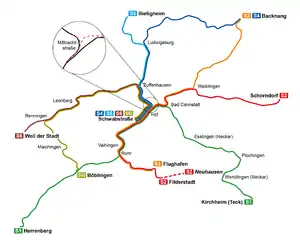 Stuttgart S-Bahn network with Schwabstraße station in the middle