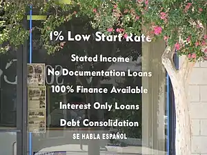 A mortgage brokerage in the US advertising subprime mortgages in July 2008