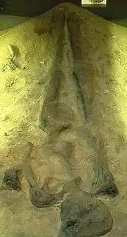 As a body was not found, there was early speculation that the ship-burial was a cenotaph, but soil analyses conducted in 1967 found phosphate traces, supporting the view that a body had disappeared in the acidic soil.[54] The presence of a platform (or a large coffin) that was about 9 feet (2.7 m) long was indicated.[55] An iron-bound wooden bucket, an iron lamp containing beeswax, and a bottle of north continental manufacture were close by. The objects around the body indicate that it lay with the head at the west end of the wooden structure.