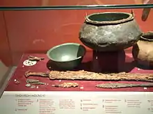By the man's head were a firesteel and a leather pouch, containing rough garnets and a piece of millefiori glass. Around the coffin were two spears, a shield, a small cauldron and a bronze bowl, a pot, an iron-bound bucket and some animal ribs. In the north-west corner of his grave was a bridle, mounted with circular gilt bronze plaques with interlace ornamentation.[32] These items are on display at Sutton Hoo.