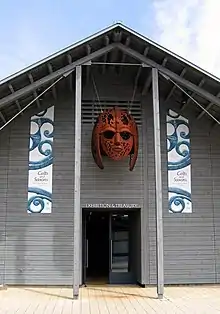 In 2000, a Suffolk County Council team excavated the site intended for the National Trust's new visitor centre, north of Tranmer House, at a point where the ridge of the Deben valley veers westwards to form a promontory. When the topsoil was removed, early Anglo-Saxon burials were discovered in one corner, with some possessing high-status objects.[42] The area had first attracted attention with the discovery of part of a 6th-century bronze vessel, of eastern Mediterranean origin, that had probably formed part of a furnished burial. The outer surface of the so-called "Bromeswell bucket" was decorated with a Syrian- or Nubian-style frieze, depicting naked warriors in combat with leaping lions, and had an inscription in Greek that translated as "Use this in good health, Master Count, for many happy years."[43]
