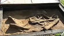 This important grave, damaged by looters, was probably the source of the many iron ship-rivets found at Sutton Hoo in 1860. In 1938, when the mound was excavated, iron rivets were found, which enabled the Mound 2 grave to be interpreted as a small boat.[37] Carver's re-investigation revealed that there was a rectangular plank-lined chamber, 5 metres (16 ft) long by 2 metres (6 ft 7 in) wide, sunk below the land surface, with the body and grave-goods laid out in it. A small ship had been placed over this in an east–west alignment before a large earth mound was raised.[38]