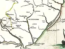 South of Woodbridge, there are 6th-century burial grounds at Rushmere, Little Bealings, and Tuddenham St Martin[7] and circling Brightwell Heath, the site of mounds that date from the Bronze Age.[8] There are cemeteries of a similar date at Rendlesham and Ufford.[9] A ship-burial at Snape is the only one in England that can be compared to the example at Sutton Hoo.[10]