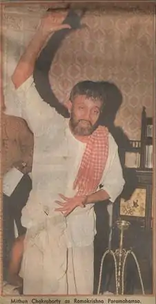 Sarvadaman D. Banerjee played the role of Vivekananda in this film. Banerjee was a regular actor in Iyer's films and portrayed the role of Adi Shankara in his film Adi Shankaracharya (1983) too. Bengali film actor Mithun Chakraborty portrayed Ramakrishna's character. This was his first film with Iyer.[2] After receiving "Lifetime achievement award" in 2012 Chakraborty told, he tried to follow the teachings of Swami Vivekananda throughout his acting career.[4] Chakraborty cast in the role of Ramakrishna Paramahamsa, lends credence to the film by his sterling acting histrionics which earned him the accolade as an "intuitive and mysticalin a tour de force rendering". Debashree Roy was choiced to play Sarada Devi, the consort of Ramakrishna. Roy told in an interview that the acting in the film as Sarada Devi was a special blessing for her and she felt "strange emotions" during the shooting.[5] Apart from the lead roles the film has a galaxy of famous stars in different small roles resulting in its production budget touching Rs 30 million. Hema Malini has acted in the role of overdressed Bhavatarini, Raakhee is cast as Rajasthani tribal woman, Jaya Prada is in a dancing girl role. Many famous male actors like Mammooty, Shammi Kapoor, Shashi Kapoor and Anupam Kher also have small roles.[1]