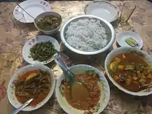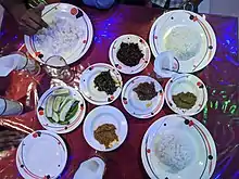 The Garo people are an ethnic and religious minority in Mymensingh region with their own unique culture and cuisine.[3][47] Their cuisine is notable for the use of pork, eel, and turtle meat.[3] The Garo brew liquor at home[3] and cook with soda and in bamboo.[48]