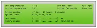 Software monitors occur more commonly, sometimes as a part of a widget engine. These monitoring systems are often used to keep track of system resources, such as CPU usage and frequency, or the amount of free RAM. They are also used to display items such as free space on one or more hard drives, the temperature of the CPU and other important components,[3] and networking information including the system IP address and current rates of upload and download. Other possible displays may include the date and time, system uptime, computer name, username, hard drive S.M.A.R.T. data, fan speeds, and the voltages being provided by the power supply.
