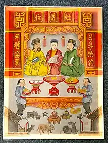 A long time ago, there was a couple, Trọng Cao and his wife Thị Nhi who were married for many years but had no children. One day, they quarreled over some trivial matter, and the husband, in a fit of anger, beat and threw his wife out of their home. Although Thị Nhi still loved her husband, she had no choice but to go away. Thị Nhi went far away and met a very kind man called Phạm Lang. He married her and he loved Thị Nhi very much. Their life was happy and peaceful but Thị Nhi could not forget her first love. As for Trọng Cao, he had been filled with remorse from the day he sent his wife away. He waited, and waited hopelessly for his wife’s return. Eventually, he decided to set out from his home to search for Thị Nhi. He traveled far and wide, but he could not find his wife. His food ran out and he had to beg for his meals. One day, starving and thirsty, he knocked on the door of a house to ask for food. He was shocked when he recognized his former wife. The sudden appearance of Trọng Cao deeply moved Thị Nhi, and she invited him inside and gave him a good meal. Suddenly, there was a knock on the door. It was Phạm Lang returning. The thought of being discovered with her former husband sent Thị Nhi into a panic. She hid Trọng Cao under a stack of straw. Unfortunately, Phạm Lang set fire to the straw because he needed ashes to fertilize his field. As the flames spread out, Trọng Cao accepted his fate to be burnt to death to protect Thị Nhi’s virtue. Thị Nhi was distraught because her love for Trong Cao had caused his death. Thị Nhi could neither save Trọng Cao from the fire nor tell her husband. She had no choice but to throw herself into the flames. Phạm Lang could not understand why his wife killed herself. Filled with sorrow, he jumped into the burning fire and died with his loving wife. Ngọc Hoàng in the heavens knew the sad story. He was so moved by their devotion and deep love that he decided to help them to live together forever. Using his magic, he changed them into the three hearthstones around the cooking fire, where they became Kitchen Gods. Since that time, the three Táo Quân have been responsible for taking care of all household affairs. Each year, on the 23rd of the last month of the lunar year, the Táo Quân leave the kitchen, they are seen off by the owner of the house, and ride on a carp to the heavens to give a report on each family’s doings. Then they return on the Eve of the first day of the Lunar year.[1][2]