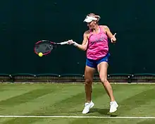 After years of weak singles performances, Babos, at the opening week, reached semifinal which she lost to Alison Riske.[21] Followed by second round of the Australian Open, quarterfinal of the St. Petersburg Trophy and third round of the Premier 5 Qatar Open.[28][29][30] At the Miami Open, she reached the round of 16 for the first time at some Premier 5/Mandatory tournament, missing her chance to reach the quarterfinal, losing to Angelique Kerber.[31] She continued, reaching the quarterfinal at the Katowice Open and semifinal at the Morocco Open.[32][33] At the Italian Open, she beat Venus Williams in the second round, before losing to Madison Keys.[34][35] In early August, she advanced to the Brasil Cup final, but lost to Irina-Camelia Begu.[36] She then reached her first Premier 5 quarterfinal at the Cincinnati Open, losing there to fourth seed Garbiñe Muguruza.[37] At the US Open, she reached third round for the first time at major event in singles, but then was defeated by seed Simona Halep.[38] So she made her top 30 debut, and in the following week, she climbed to her career-high singles ranking of 25.[39] In her last two singles tournaments, Babos reached the quarterfinal at the Kremlin Cup and then qualified for the first time for the year-end WTA Elite Trophy.[40] However, she lost in her round-robin group to Bacsinszky and Zhang Shuai.[41][42]