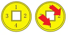The reverse side of the Tự Đức Bảo Sao are read in an unorthodox way, as usually cash coins are read top-bottom-right-left (known as "a cross pattern"), as is the case for the obverse of this series.[8] This isn't the case with the reverse which are read in the order of top (12 o’clock), right (3 o’clock), left (9 o’clock), and then bottom (6 o’clock).[8] For example the 60 văn coin's reverse is read Chuẩn lục thập văn (準六十文), rather than Chuẩn văn lục thập (準文六十), though the incorrect reading was advanced by some authors like Lacroix and is used in sources like the catalogue of currencies in the collection of the Bibliothèque nationale de France.[8]