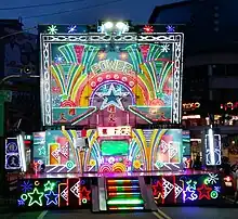 Taiwanese Electric Flower Cars (traditional: 電子花車, simplified: 电子花车, pinyin: diànzi huā chē) are trucks that have been converted into wheeled, neon-lit platforms, typically moving stages, upon which strippers can perform as the vehicle participates in religious, celebratory or funeral processions. These performances generally include stripping and occasionally involve full-on nudity. A. Marc L. Moskowitz remarked in his making of the documentary Funeral Strippers in Taiwan that stripping down to complete nudity on the Electric Flower Car has gone "underground because there were laws enacted against full nudity in the mid-80's".[1] As such, the tradition of the Electric Flower Car has generated a considerable amount of controversy.