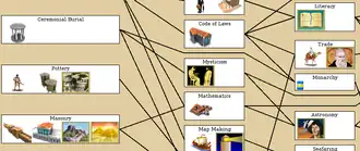 In strategy games, a technology, tech, or research tree is a hierarchical visual representation of the possible sequences of upgrades a player can unlock (most typically representing the research progress of a given faction). Because these trees are technically directed and acyclic, they can more accurately be described as a directed acyclic graph of technologies. The diagram is tree-shaped in the sense that it branches between each 'level', allowing the player to choose one sequence or another.[1] Each level is called a tier and is often used to describe the technological strength of a player. Typically, at the beginning of a session of a strategy game, a player will start at tier 1, which offers only a few options for research. Each technology that a player researches will normally open up one or more new options, but may also, depending on the computer game, close off the paths to other options. The tech tree is the representation of all possible paths of research a player can take, up to the culmination of said sequence.