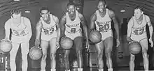 Members of the 1963–64 Baltimore Bullets, From left to rightː Rod Thorn, Charles Hardnett, Walt Bellamy, Gus Johnson and Terry Dischinger. Thorn, Bellamy and Johnson were elected to the Naismith Basketball Hall of Fame as players while Dischinger was elected as part of the 1960 Olympic team.