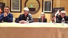 Left to right: book author Markus Zusak, stars Geoffrey Rush and Sophie Nélisse, director Brian Percival, interviewed about The Book Thief by Selig Film News in 2013.
